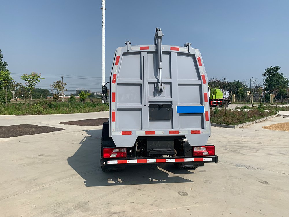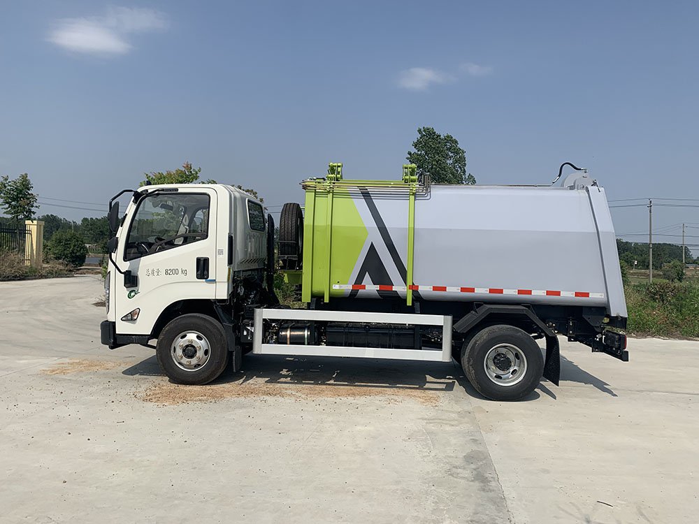 该车广泛适用于城镇街道、生活小区的垃圾收运作业,主要优点是整车长度短,转向掉头灵活,能很好适应各种道路工况,深入各种大街小巷作业;垃圾箱有效容积大,可达到 8m³;采用侧面自动上料,减小工人作业往返距离,工作效率高;垃圾箱内带推板,可以轻度压缩垃圾,提高箱内有效容积利用率;采用推板自动卸料,操作员在驾驶室内即可完成卸料作业,有效改善工人的作业环境;整车外形美观,便于清洗和自洁;自带大容量防渗漏污水箱,避免运输过程。